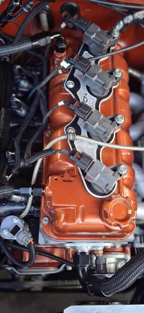 Mounts to the stock valve cover mounting points, allows you to run chrysler ignition coils. Lead time 2-3 weeks. Ships with BRETON logo or can be custom engraved for an extra fee.